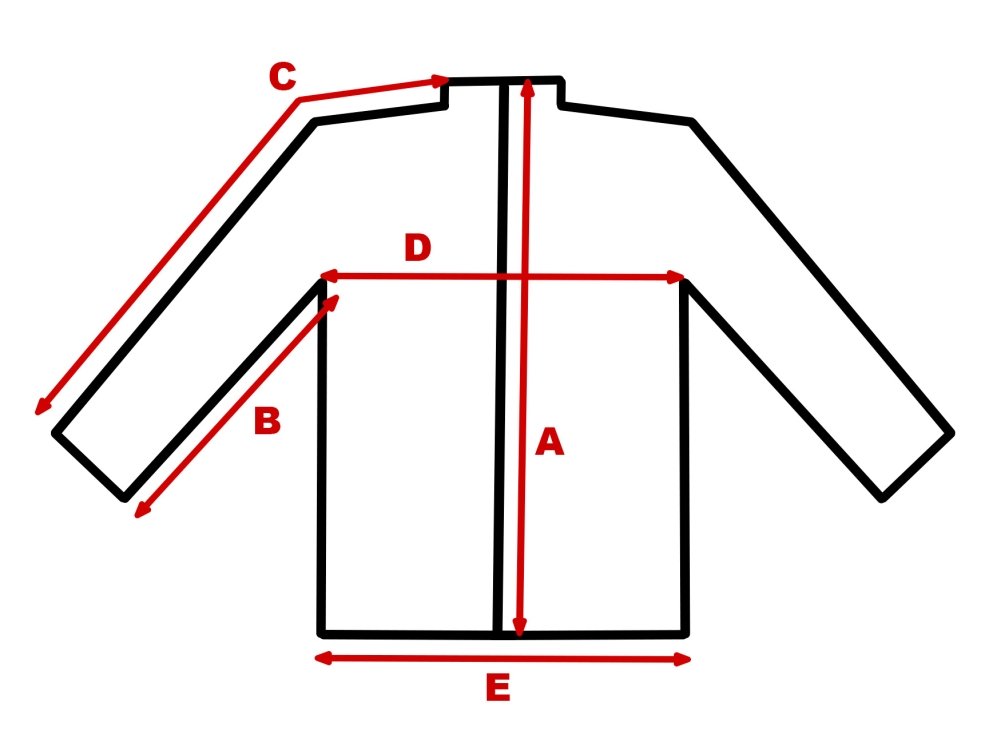 В таблице ниже указаны внешние габаритные размеры в сантиметрах, которые сделаны рулеткой. Мотокуртка при этом лежит на столе, свободно, в естественном положении. [А] - длина фронтальной молнии. [C] - расстояние от края рукава до стыка воротника с плечом.